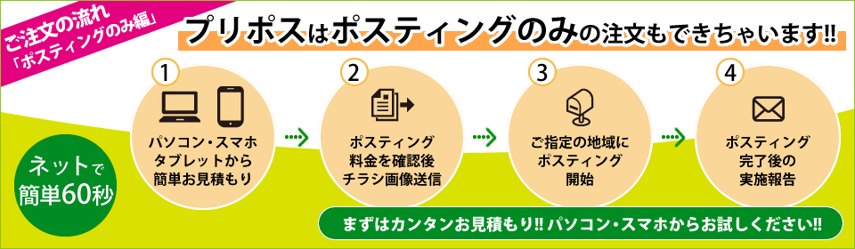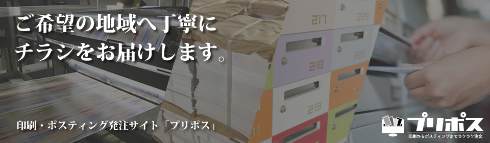 - 「ポスティングのみ」のご購入の場合、誠に恐れ入りますが、チラシの納品費用はお客様のご負担でお願い申しあげます。