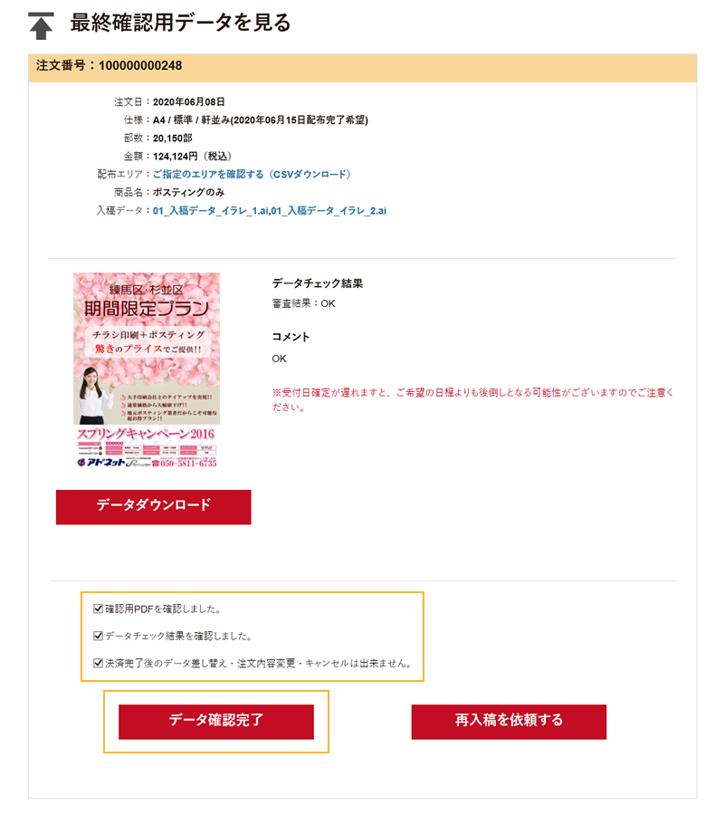 - チラシ内容の最終承認は、マイページ内で「データ確認完了」ボタンをクリックをすることで完了となります。
